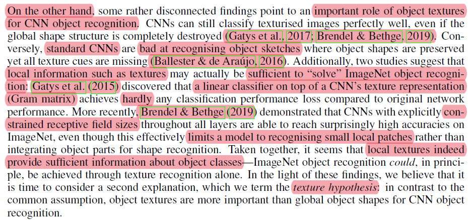 "기존에 주장한 것(두 번째 문단: shape기반의 CNN 분류)과 달리, CNN은 texture 기반으로 classification 한다. 그리고 이것을 texture hypothesis라 하겠다"