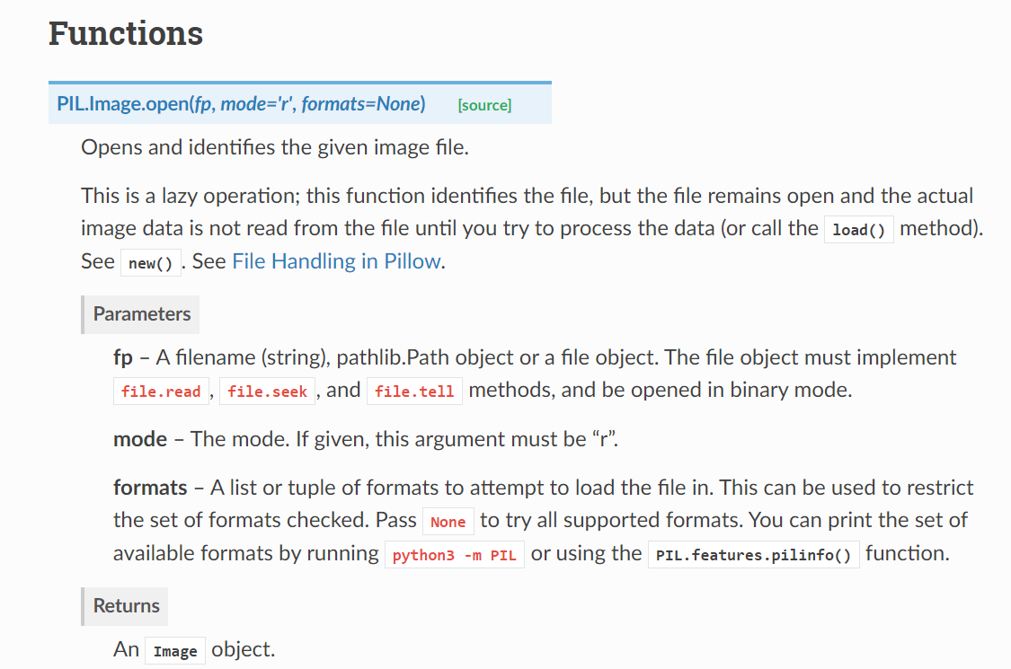Image.open() 함수의 parameter 부분에 "fp" 설명을 보면 마지막 부분에 "the file object must implement "read()", "seek()", "tell()"같은 함수를 사용해야 실제로 이미지 데이터를 load할 수 있다고 합니다. (이 부분은 뒤에서 "file.seek" 함수 를 설명할 때 더 자세히 하도록 하겠습니다)
