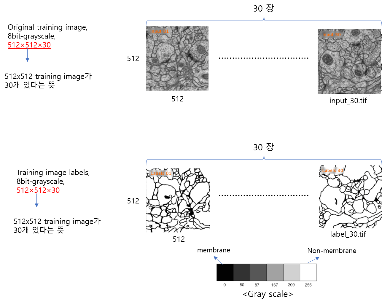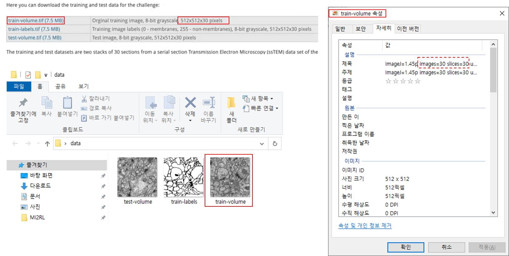 예를 들어, 아래 train-labels 이미지 정보를 보면 512×512×30 형태로 제공된 것을 볼 수 있습니다.