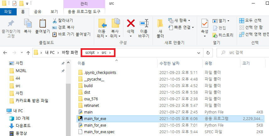 지금부터는 아래와 같이 'main_for_exe.py' 파일을 실행파일로 만들어보겠습니다.