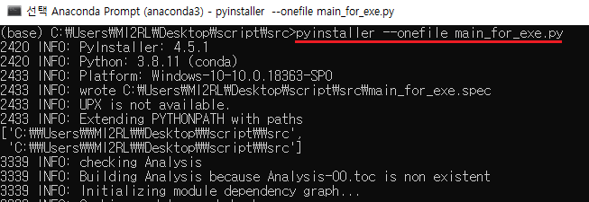 그래서, src\dist 폴더에 main_for_exe.exe 파일에 모든 모듈을 통합하도록 --onefile 옵션을 주어 파일을 다시 컴파일을 해줍니다.