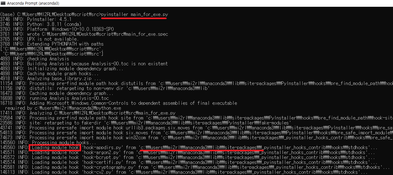 위와 같이 업그레이드를 시켜주고 다시 실행파일을 만들면 아래와 같이 hook path로써 "anaconda or pip로 설치한 패키지들이 저장되어 있는 디렉토리"를 잡아주는 것을 확인할 수 있습니다.