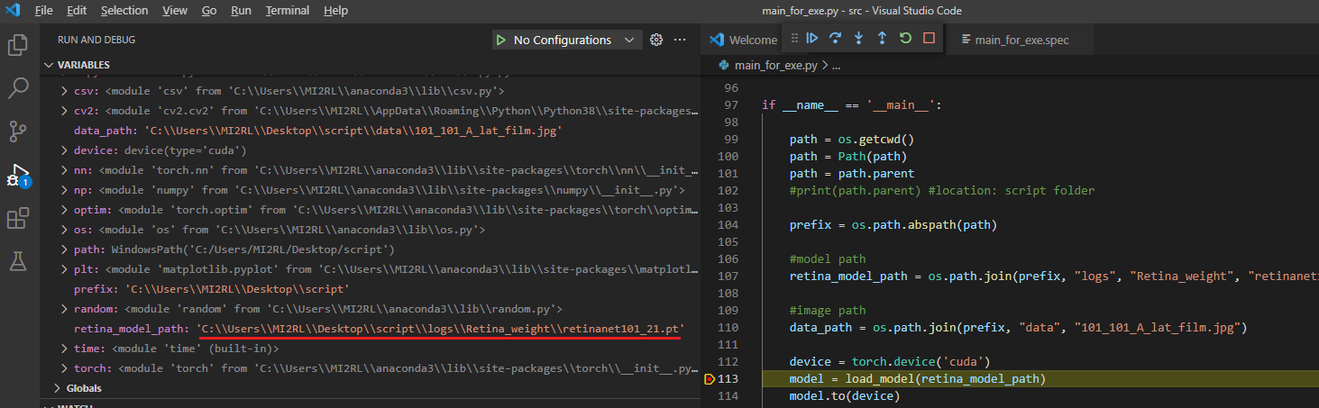 위의 에러가 난 이유를 아래 코드 디버깅을 통해 살펴보니 retina_model_path 경로 때문인 것으로 파악할 수 있었습니다. 아래 vscode 상에서는 "C:\\Users\\MI2RL\\Desktop\\script\\logs\\Retina_weight\\retinanet101_21.pt"로 잘 설정되어 있지만, 위의 Anaconda Prompt에서는 엉뚱한 경로를 설정하고 있는걸 확인할 수 있었습니다.
