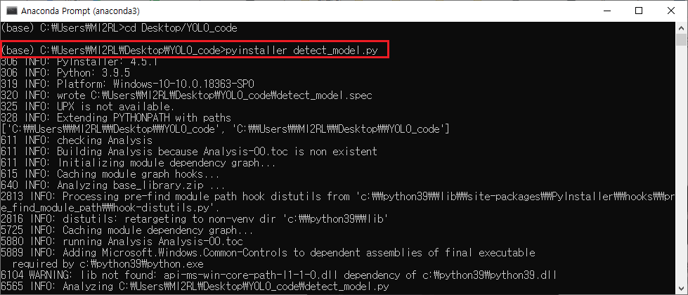3. 원하는 python 파일을 실행파일로 바꿔주기 위한 명령어를 입력합니다.