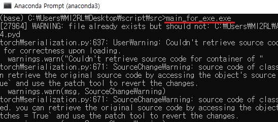 그리고, src 디렉토리에서 main_for_exe.exe 파일을 실행시키면, 아래와 같이 warning 메시지만 뜨고 문제 없이 실행되는 걸 확인 하실 수 있습니다.
