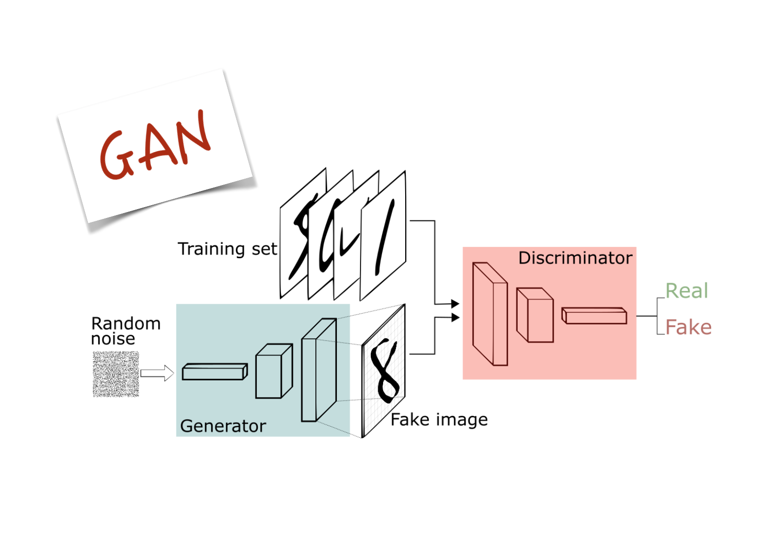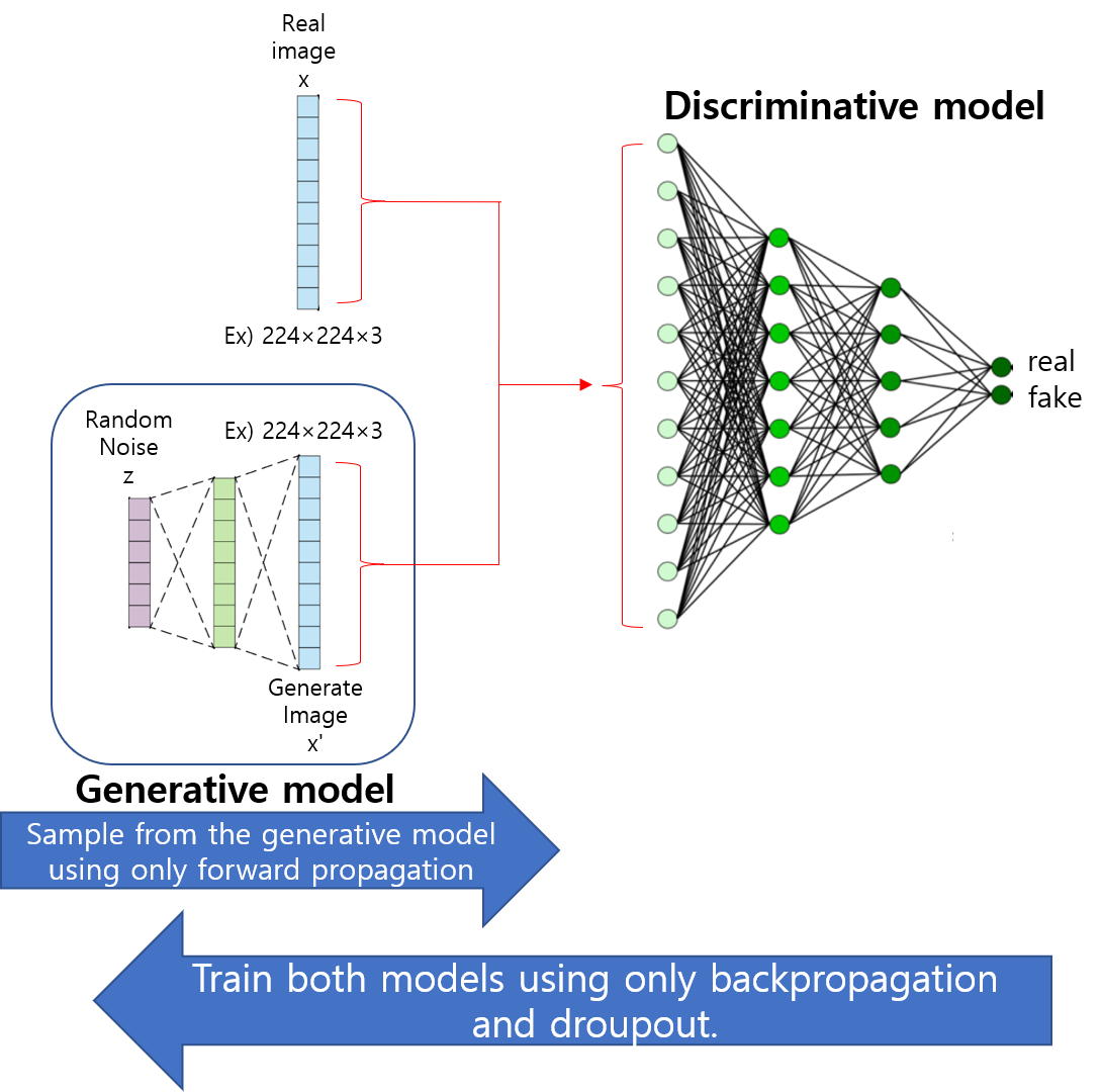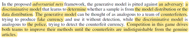 GAN이라는 구조에서는 generative model의 경쟁자를 discriminator model로 두고 있습니다. 그리고, 앞서 언급한 경쟁이라는 표현보다는 "adversarial(적대적)"이라는 표현을 사용합니다. "Adversarial"이라는 표현을 쓴 이유는 generative model과 discriminator model은 서로 반대의 목적을 갖고 있었기 때문이라고 생각합니다 (경쟁이라는 표현은 사실 같은 목적을 두고도 사용할 수 있으니까요).