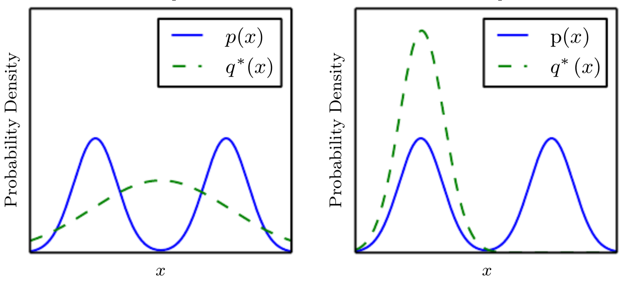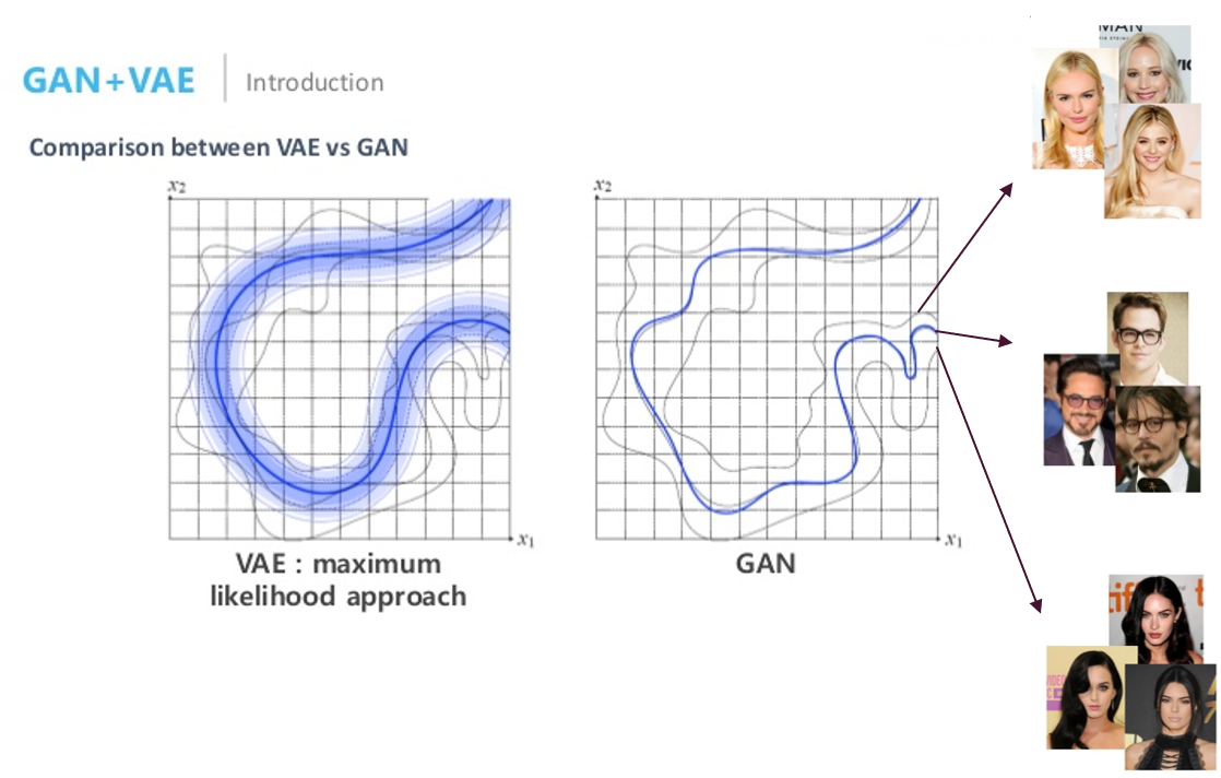 가운데 실선에 해당하는 데이터 셋이 제일 많다고 하면, VAE는 제일 데이터 셋이 많은 그룹에 맞게 distribution을 형성하면서 동시에 normal distribution을 이용해 주변 이미지 그룹들도 다 포괄할 수 있도록 학습을 하기 때문에 모든 데이터 그룹을 포괄하려는 것을 볼 수 있습니다.