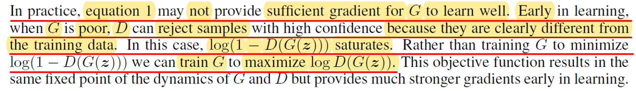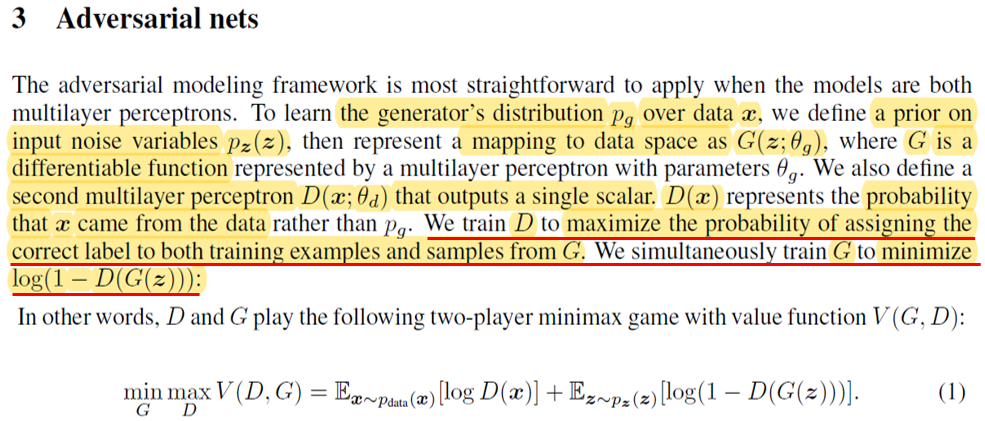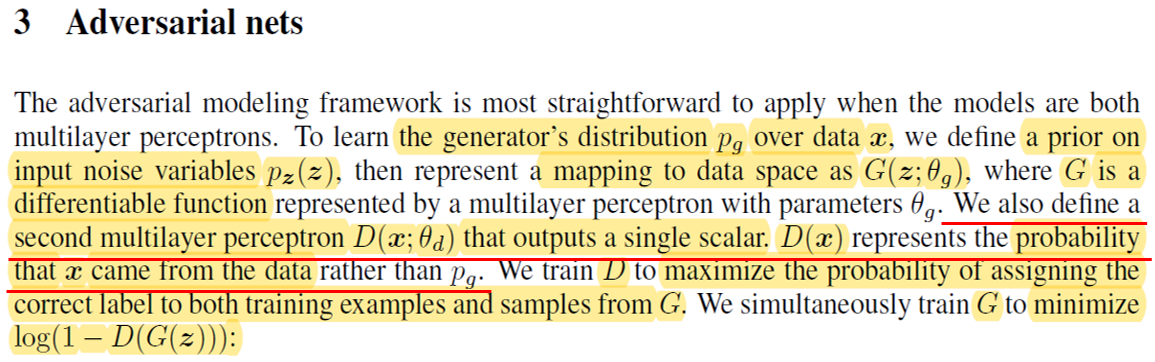 "a discriminative model D that estimates the probability that a sample came from the training data rather than G."라는 표현을 쓴 이유는 discriminative model이 기준을 'generative model로 부터 생성된 이미지인지를 판별하는 것'에 두는 것이 아니라, '실제 이미지인지를 판별하는 것'에 두는 것으로 봤기 때문이 아닌가 싶습니다. (CNN 관점에서 보면 background or negative sample 들을 잘 구별할 수 있게 학습하는 것과, foreground or positive sample들을 잘 구별할 수 있게 학습하는 것은 다른 문제이니까요. 예를 들어, 한 이미지에는 대부분 negative sample or background들이 많을 텐데, 이를 방치해두면 학습시 인공지능 모델이 background or negative sample만 잘 구분할 수 있도록 학습하게 될거에요. ) ← 혹시 이 부분에 대해서 다른 의견이 있으면 댓글로 남겨주세요!