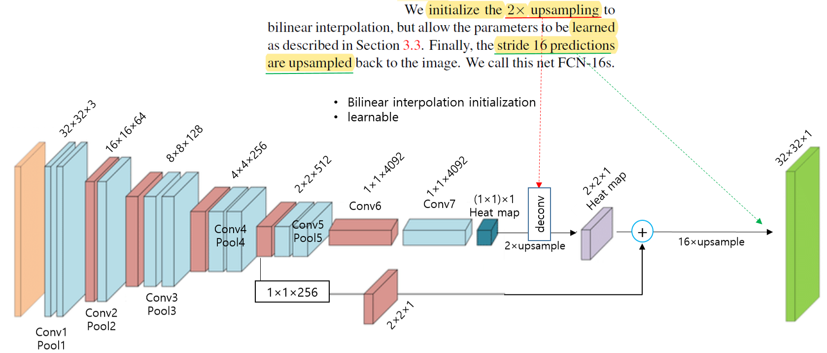 Deconvolutional layer 부분에서 마지막 layer에 해당하는 부분은 bilinear interpolation 방식을 이용하는 filter 값들이 고정된 값으로 지정됩니다.