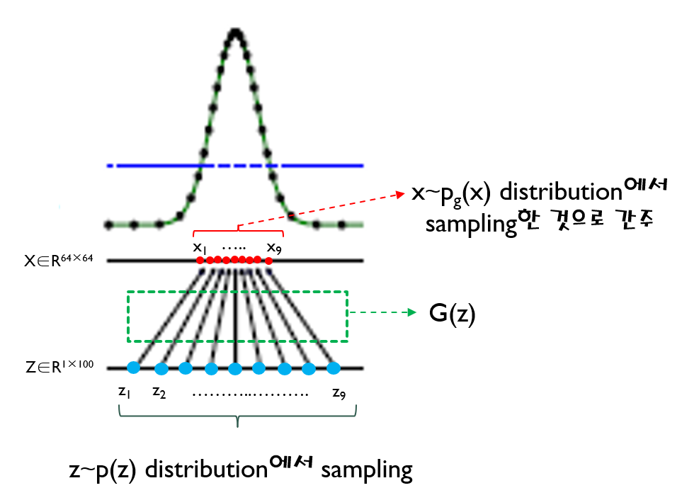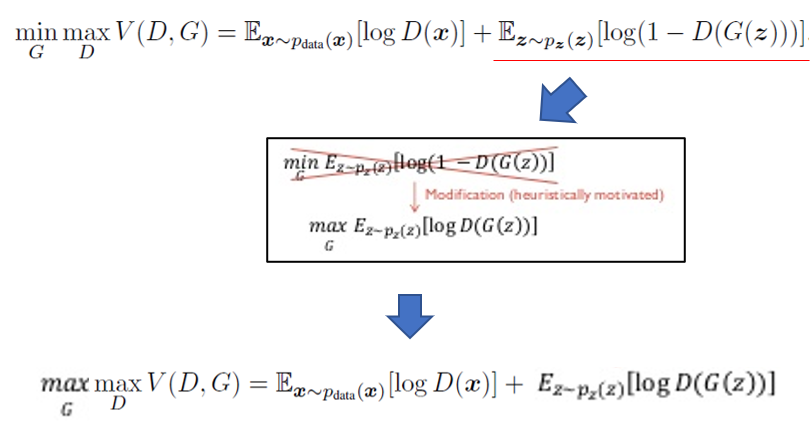 위 수식을 보면 G(z)를 x로 바꿔 주면서 \(E_{z\sim ~p_{z}(z)}\) 수식부분이 \(E_{x\sim ~p_{g}(x)}\) 로 변경된 것을 확인할 수 있습니다. 이것이 가능한 이유는 G(z)의 차원이 곧 X차원과 동일하여 G(z)에서 발생한 값을 X 차원 상의 하나의 x값으로 표현(=mapping)할 수 있기 때문입니다.