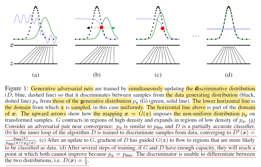 GAN을 통해 생성하는 데이터의 분포 \(p_{g}\)를 추정하고 최적화 하는 것이 아니라, \(p_{g}\)를 생성하는데 직접적인 영향을 미치는 parameter인 \(\theta_{g}\)를 추정하고 최적화 합니다. 또한, 엄밀히 말하자면 수학적인 증명에서는 generative model, discriminative model이 neural network를 사용한다는 언급이 없습니다. 그런데, Generative model을 MLP(multilayer perceptron; neural network; deep learning)와 같은 것으로 설정하게 되면 실제로 최종 loss function 자체가 convex하지 않을 수 있고, 즉 multiple critical points를 가질 수 있습니다. 하지만, 마법같은 MLP는 이러한 theoretical guarantees가 굳이 보장되지 않고도 나름 생성모델에서 잘 작동한다고 주장하고 있습니다.
