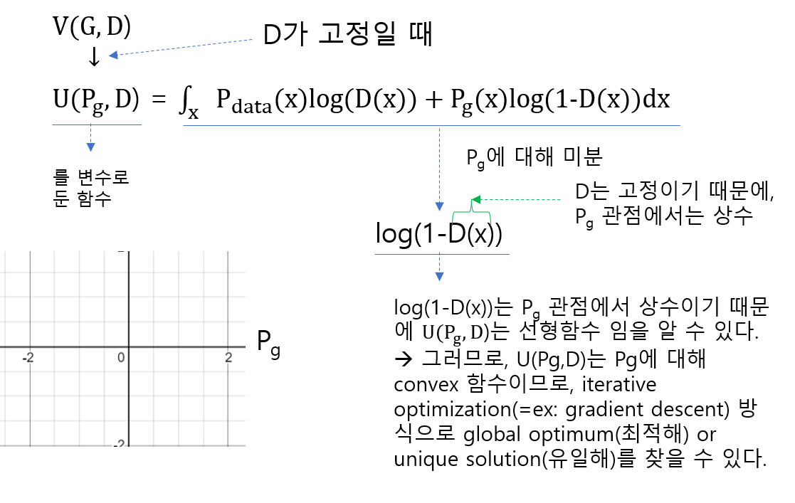 아래 그림을 잠깐 설명해보겠습니다. D는 고정했기 때문에 \(U(P_{g},D)\) 를 \(P_{g}\) 관점에서 보면 D는 (고정된) 상수값입니다. 바꿔말해,\(P_{g}\)관점에서 보면 \(U(P_{g},D)\)의 변수는 \(P_{g}\)인 셈인 것입니다. 결국, \(P_{g}\)가 학습함에 따라서 변할 텐데, 변하는\(P_{g}\)에 따라서 \(U(P_{g},D)\)가 convex한지 알아봐야 iterative optimization(=ex: gradient descent) 방식으로 global optimum을 찾을 수 있는지 확인 할 수 있습니다.