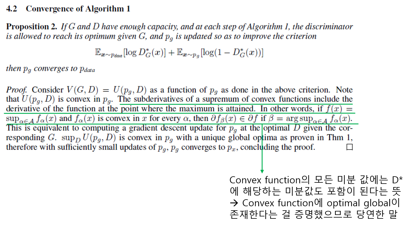 위에 있는 질문을 바꿔서 표현하면 "\(p_{g}\)가 \(p_{data}\)로 수렴할 수 있는가?"로 표현할 수 있습니다. 즉, generative model인 \(p_{g}\) 관점에서 loss 함수가 (global optimum으로) convergence(수렴) 할 수 있는지 따져야 하는 것입니다.