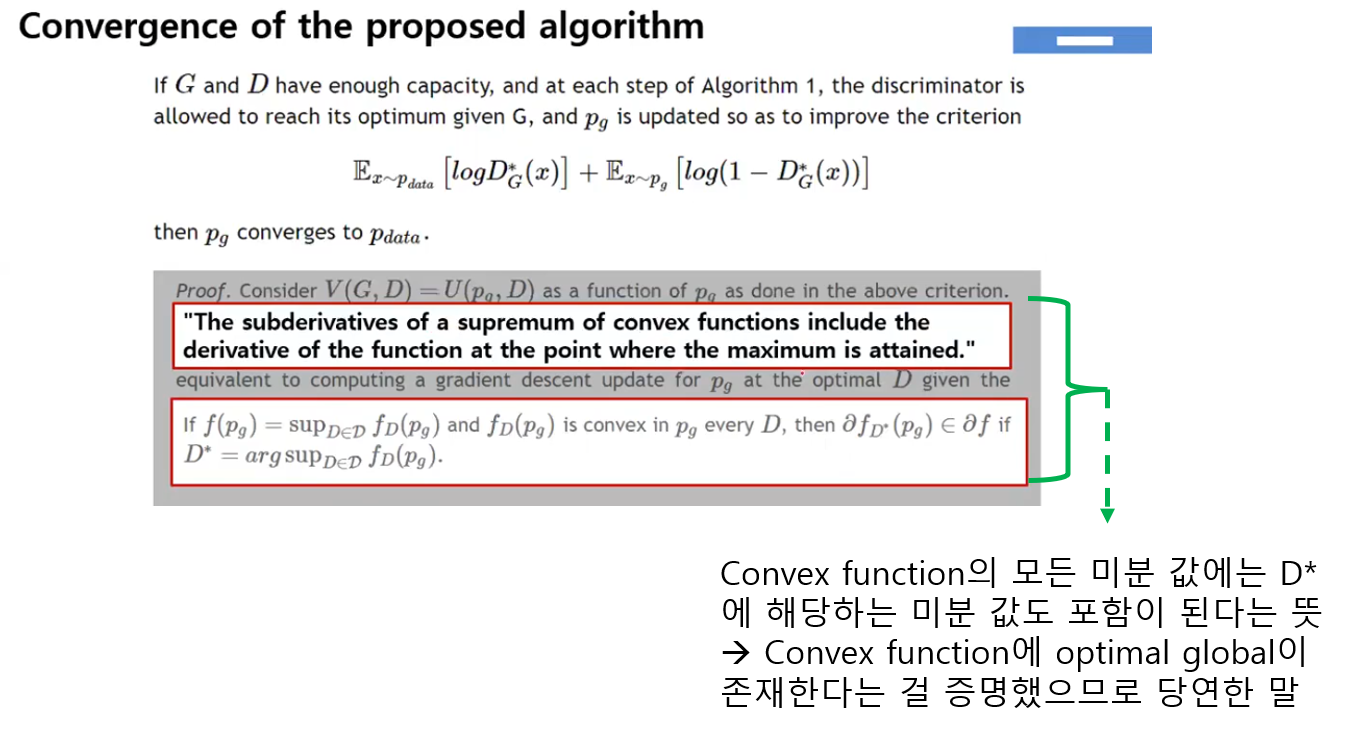 "Generative model인 \(p_{g}\) 관점에서 loss 함수가 (global optimum으로) convergence(수렴) 할 수 있는지 따지기 위해서는 'D를 고정시키고, loss 함수가 convex한지 확인하는 것' 입니다."
