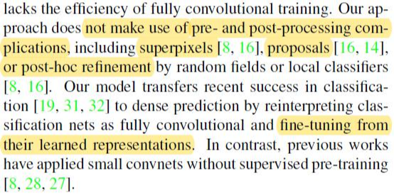 Scratch training: FCN의 downsampling 하는 부분이 보통 pre-trained CNN 모델을 사용합니다. 만약 segmentation을 scratch training 하려면 downsampling 부분(=pre-trained CNN)도 scratch training이 되어야 합니다. 그러므로 시간상 비효율적이라고 언급하고 있네요 (사실 시간적인 부분도 그렇고 pre-training 한 후, transfer learning을 통해 학습한 filter들이 scratch training을 통해 학습된 filter들 보다 더 다양할 것 같아 성능면에서도 transfer learning을 적용하는게 더 좋을 것 같다는게 제 개인적인 생각입니다).