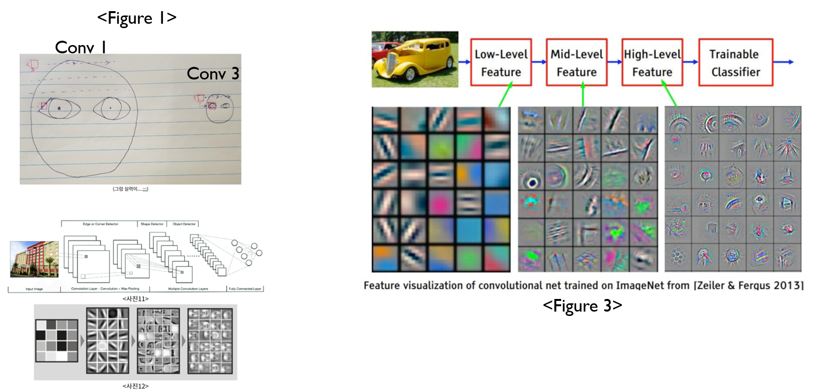 • iii 이미지들은 좀 더 뒷 쪽(=N번째 layer)에 위치한 Conv layer에 해당하는 conv filter(=주로 좀 더 추상화된 object or texture 등의 특징을 뽑아냄) 들을 통해 출력한 feature map들이다.