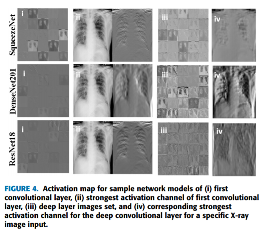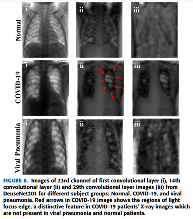 예를 들어, 아래와 같이 DenseNet201 모델의 14번째 convolution layer의 23번째 conv filter를 이용하면 normal, COVID-19, Penumonia를 구분할 수 있는 feature들을 감지할 수 있다는걸 알 수 있습니다.