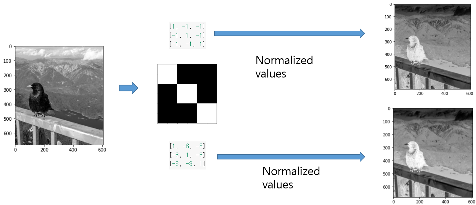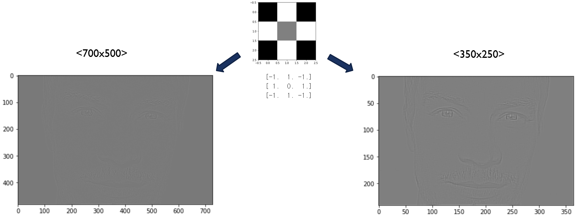 또한, -8값의 필터를 통과한 결과 feature map이 좀 더 contrast(대비)큽니다(=흰색부분이 좀 더 진한거 같음). 그 이유를 추측해보면 곱해주는 배수가 커질 수록 conv filter를 통해 생겨난 출력값들간의 편차가 더 심해지기 대문이라는걸 알 수 있습니다.