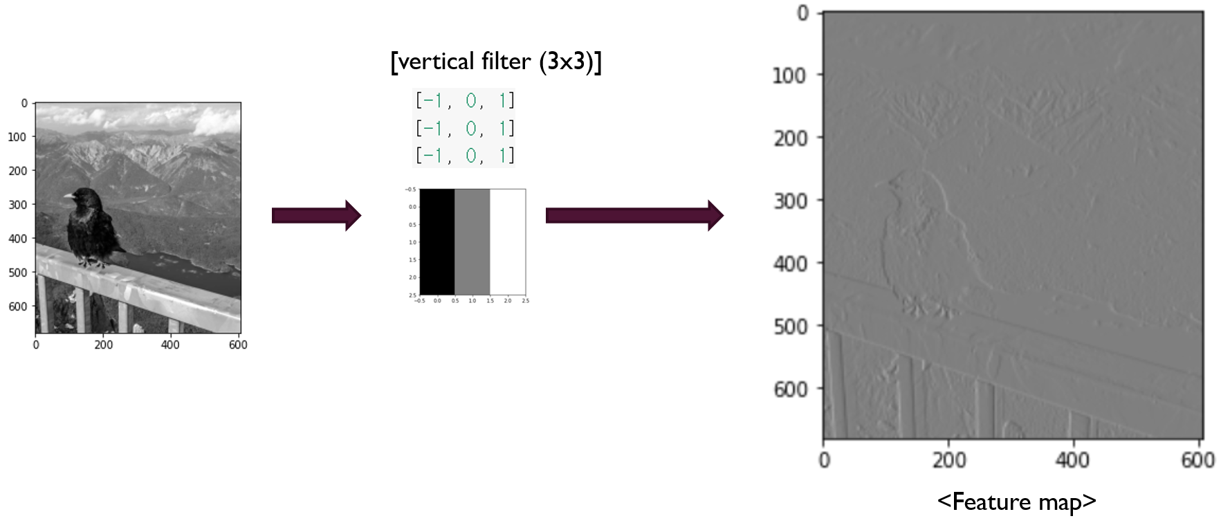 "즉 feature map을 통해서 어떤 feature들이 뽑힐지 conv filter (vertical filter)만 보고도 추측할 수 있는 것이죠."