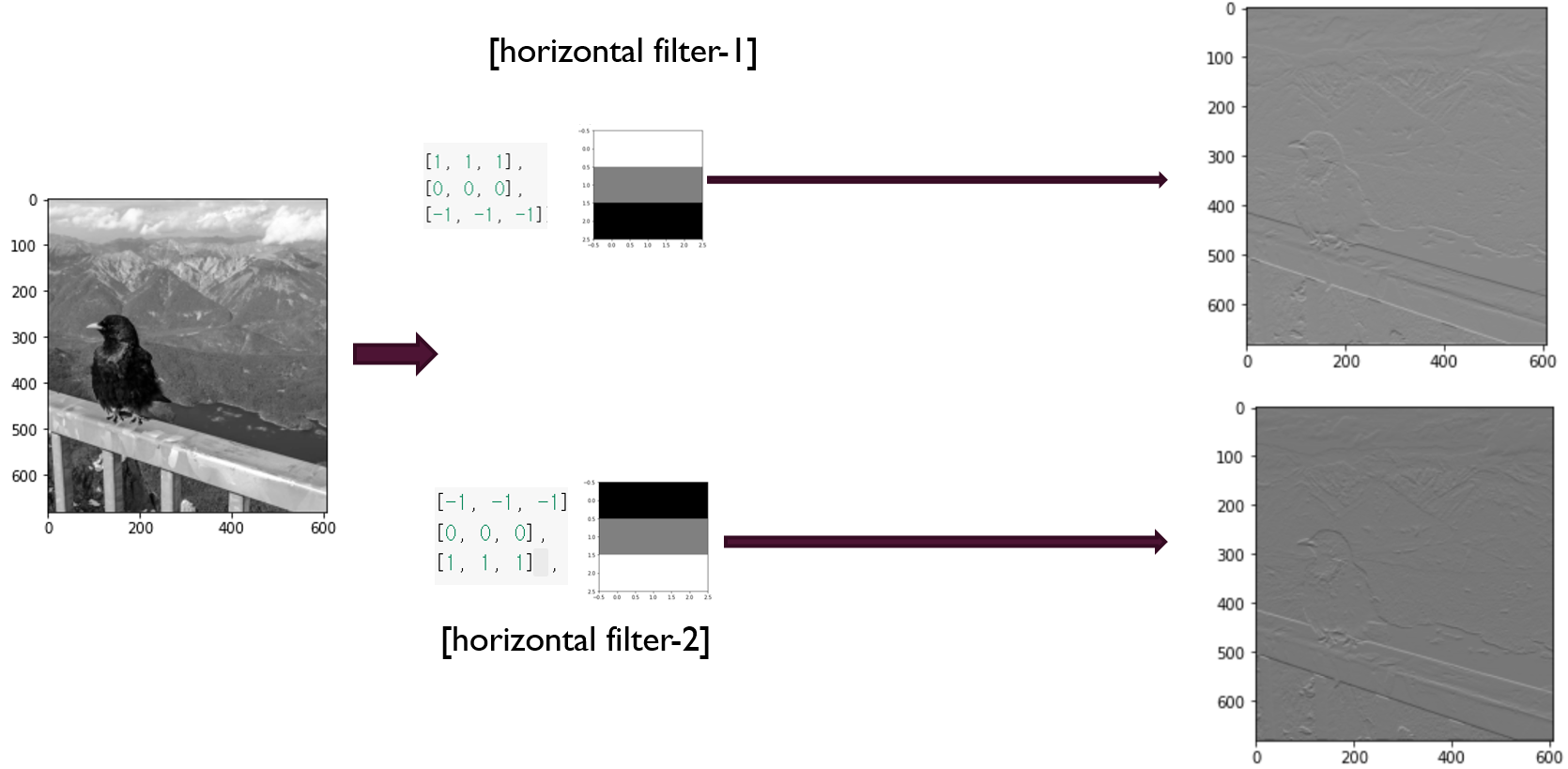 아래 conv filter는 horizontal edge feature를 뽑아냅니다. Horizontal filter 1은 흰색에서 검은색(밝은 곳에서 어두운 곳으로)으로 경계가 바뀌는 horizontal 부분의 feature들을 뽑아냅니다. Horizontal filter 2는 검은색에서 흰색(어두운 곳에서 흰색인 곳으로)으로 경계가 바뀌는 horizontal 부분의 feature들을 뽑아냅니다.