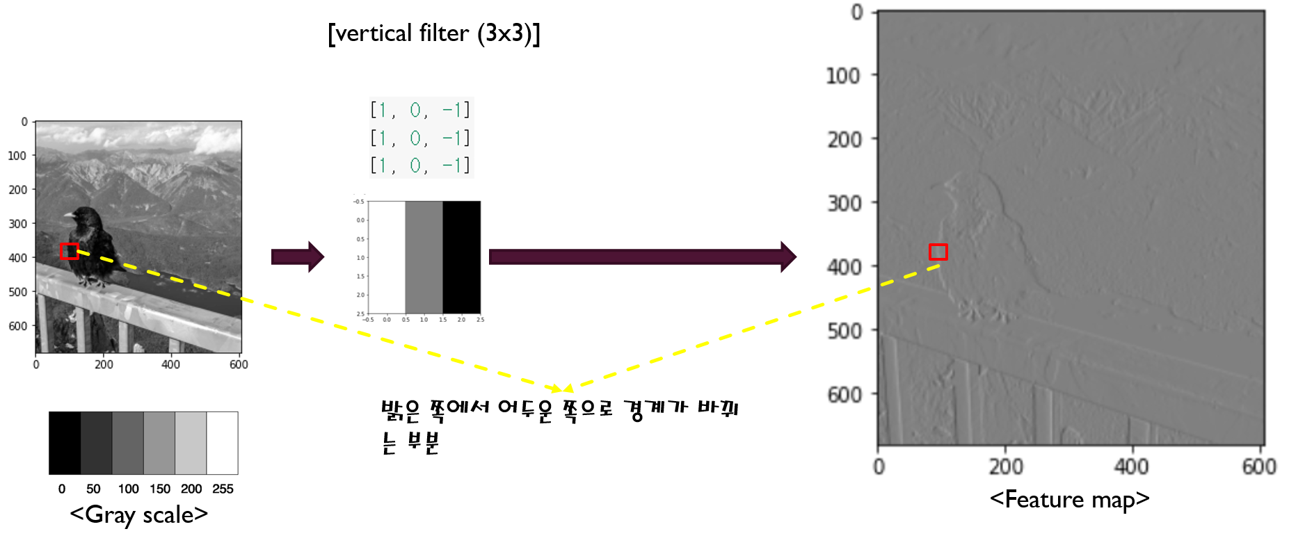입력 이미지가 들어왔을 때 아래와 같이 conv filter 값들을 설정해주면, 세로 edge의 특징들이 뽑힌다는 걸 알 수 있습니다.