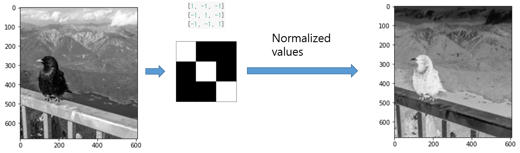 위에서 적용된 conv filter에서는 -1의 비율이 많기 때문에 대부분 실제 이미지의 밝기 정도를 반전하는 결과를 도출하게 됩니다. 예를 들어, conv filter가 적용되는 입력 위치가 가장 밝은 부분이라면 conv filter가 적용된 후 가장 어두운 부분이 되게 됩니다.