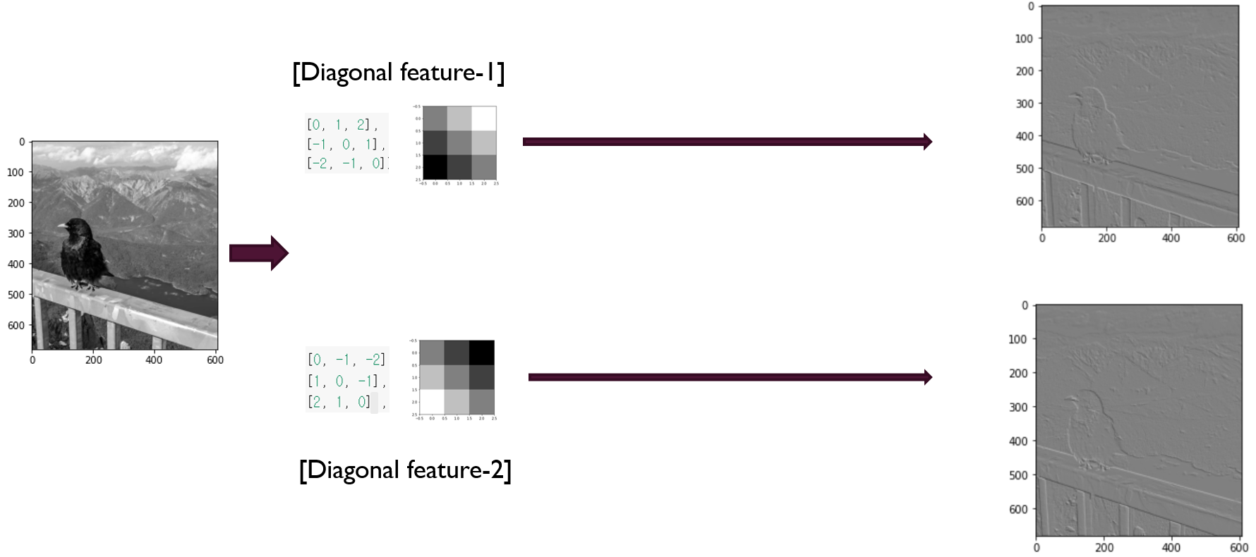 Conv filter가 아래와 같이 구성되어 있다고 해서 대각선의 특징을 뽑는 것이 아닙니다.