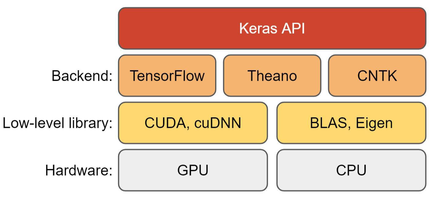 Keras는 backend engine에서 제공하는 특화된 tensor library를 사용함으로써 딥러닝의 기본적인 연산을 수행합니다. 예를 들어, tensorflow, theano, CNTK 라는 딥러닝 프레임워크를 backend로 사용합니다. 다양한 backend (tensorflow, theano, CNTK) 를 사용한다고 하여 아래와 같이 표현하기도 합니다.