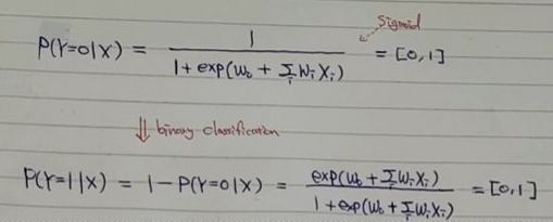 우리에게 X라는 input 데이터가 주어 졌을 때, Y가 0 또는 1을 구분 짓는 binary classification을 한다고 가정해보겠습니다. X가 주어졌을 때 Y가 0이 될 확률을 "P(Y=0|X)"와 같이 표현할 수 있고, 이것을 sigmoid function을 이용해 구체적인 (확률) 값으로 표현한다면 아래 이미지의 수식을 이용하게 됩니다. 또한, 'binary clasfication'이기 때문에 P(Y=1|X)인 경우의 확률 값을 "1-P(Y=0|X)"라고 표현 할 수 있게 되죠.