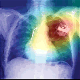 의사들이 보는 폐렴 증상은 분명 폐주위의 섬유화에 주목하겠지만, 딥러닝의 경우는 CAM(=Class Activation Map)을 통해 살펴보면 엉뚱한데를 주목하는 경향이 있습니다. 아래와 같이 엉뚱한 곳을 보는 이유는 폐렴 관련 데이터는 저런 부분들만 살펴봐도 분류가 가능했기 때문일 수 있습니다. 즉, 정답의 이유는 상관없이 "학습 데이터의 정답만 맞추면 된다"는 식인 것이죠.