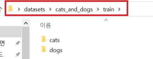 train, validation, test 데이터셋(폴더)에는 각각 클래스와 관련된 폴더가 있고, 해당 폴더에 실제 이미지 데이터가 위치합니다. cats_and_dogs 분류문제는 개와 고양이 두 클래스를 구분하는 binary classification 문제이므로, 각 폴더에 2개의 클래스(개, 고양이)가 포함되어 있습니다.