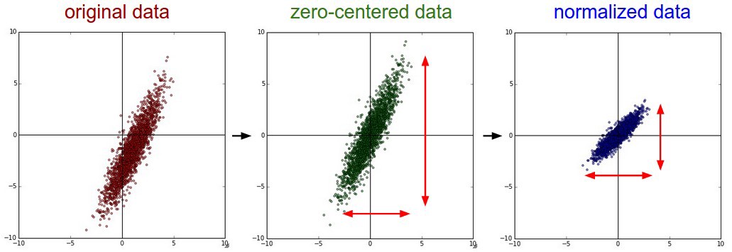 위와 같은 normalization을 적용해주기 위해서는 아래와 같이 zero center를 맞춰준후, data를 normalization 해주어야 합니다.
