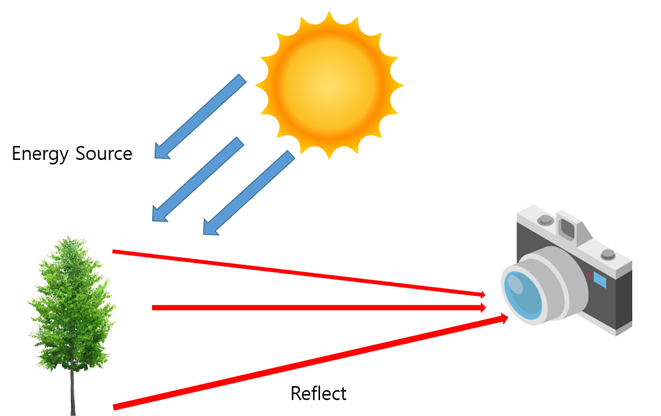 어떠한 object(객체)를 이미지로 표현해주기 위해 가장 먼저 요구되는 요소가 energy source 입니다. 예를 들어, 우리가 카메라로 어떤 물체를 찍는 것은 빛(light source)에 반사되는 객체를 capture하는 것과 같습니다.