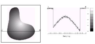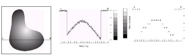 아래 그림의 맨 왼쪽 부분에 표시된 object에서 A에서 B까지 색의 변화를 표현하면 오른쪽 이미지 처럼 continous한 그래프 형태를 띄는 것을 알 수 있습니다. 이러한 continuous한 이미지를 디지털화 시켜주기 위해서 가장먼저 하는 것은 sampling 작업입니다.