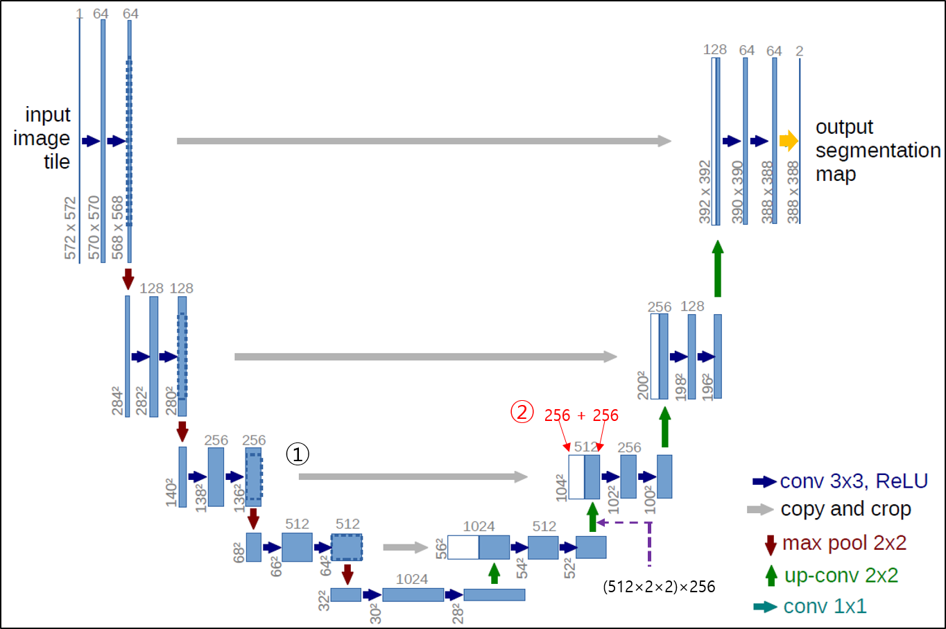 - Copy and Concatentation: Contracting path에서 crop된 (104×104)×256 feature map을 Copy → 아래 "그림10" 기준으로 같은 층에 존재하는 expansive path의 (104×104)×256 feature map에 concatenation → Concatenation 결과: (104×104)×512 feature map 생성