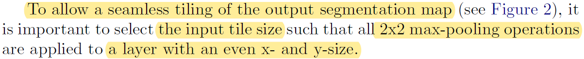 - 2×2 max-pooling을 적용하기 위해서 conv layer에 입력으로 들어오는 feature map size가 x, y축 모두 짝수가 되도록 고려해서, input title size를 설정해줘야 over-tile strategy가 잘 적용될 수 있다는 것을 언급하는 듯 합니다.