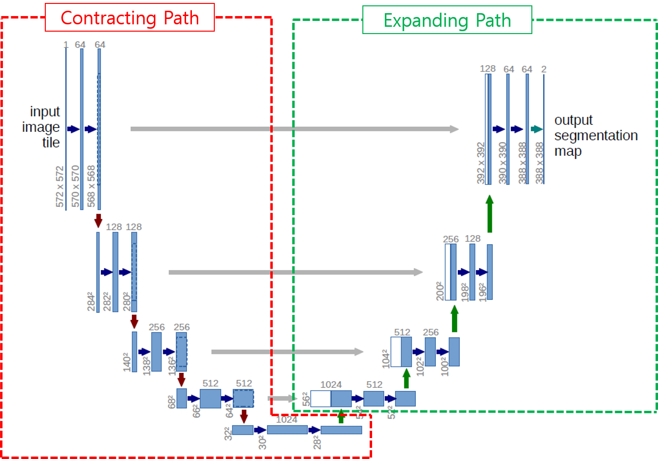 - FCN과 UNet의 차별점은 아래 "그림1"에서 같은 층(ex: contracting path 568×568×64 & expanding path 392×392×128)끼리 이어붙여주는 연산의 유무입니다. (좀 더 자세한 설명은 UNet 구조를 설명하는 부분에서 자세히 다루도록 하겠습니다.