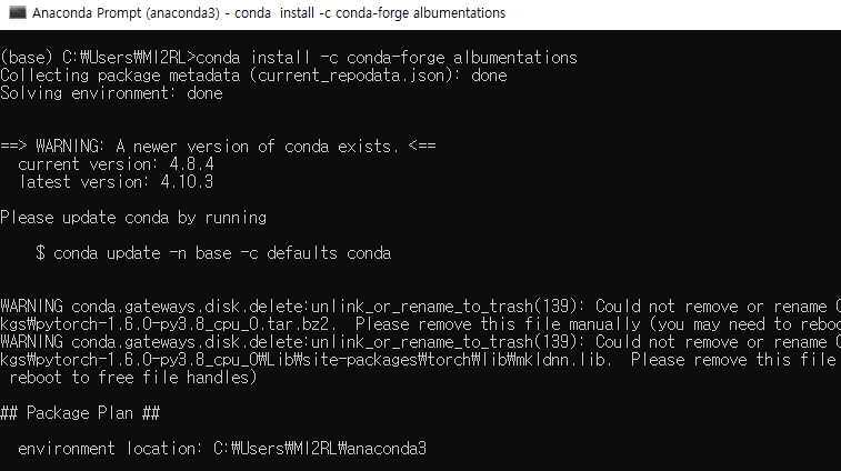 앞서 필자는 VS code interpereter에 아나콘다 가상환경을 연동해서 사용하기 때문에, anaconda 명령어를 통해 albumentations 패키지를 설치할 것이라고 언급했습니다.