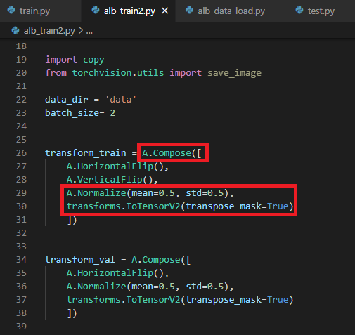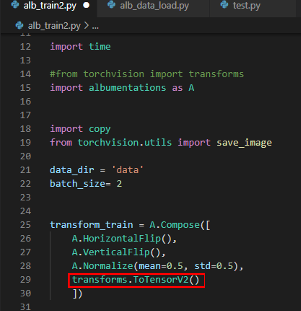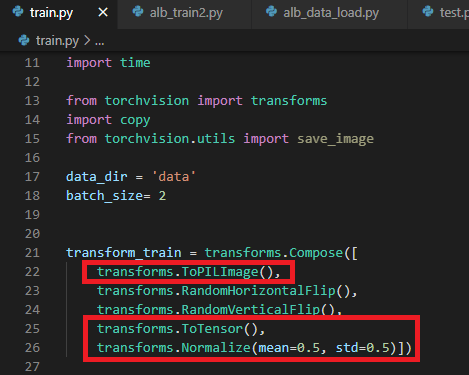 - from albumentations.pytorch import transfroms → 아래 "그림3"에서 transfor_train 부분을 보면 마지막에 ToTensorV2가 구현된 것을 볼 수 있습니다. ToTensorV2만 "albumentations.pytorch"로부터 import 한다는 걸 인지하세요!