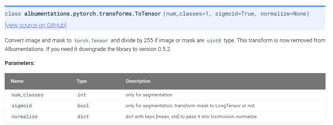 그 이유를 아래 "albumentations.pytorch.transforms.ToTensorV2()" API를 살펴본 후 알 수 있었습니다.