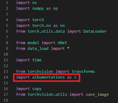 설치가 완료되면 아래와 같이 자신이 코드를 작성하고 있는 디렉토리에서 albumentations 모듈을 import해 관련 attribute or function들을 사용하면 됩니다. 그럼 지금부터 albumentations 모듈을 사용하여 데이터 로드 하는 방식을 설명해보도록 하겠습니다.