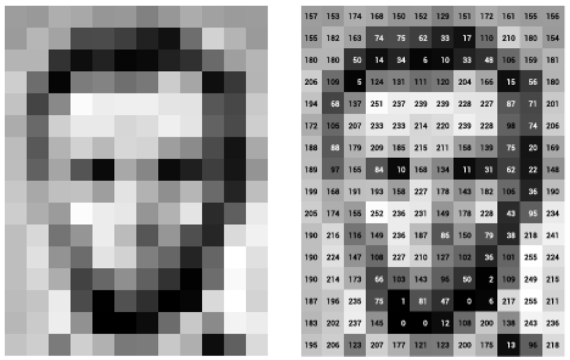 200×200 gray scale 이미지를 표현한다고 하면 어떻게 생각해볼 수 있을까요? 먼저, 이미지라는 것은 pixel의 조합으로 이루어져 있습니다. 그리고, 하나의 픽셀에는 하나의 색 표현이 가능하죠. Gray scale인 경우에는 하나의 pixel에 0~255 사이 값 중 하나가 할당될 수 있습니다.