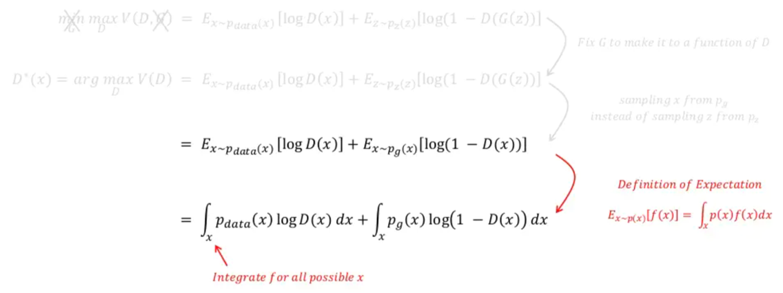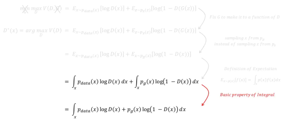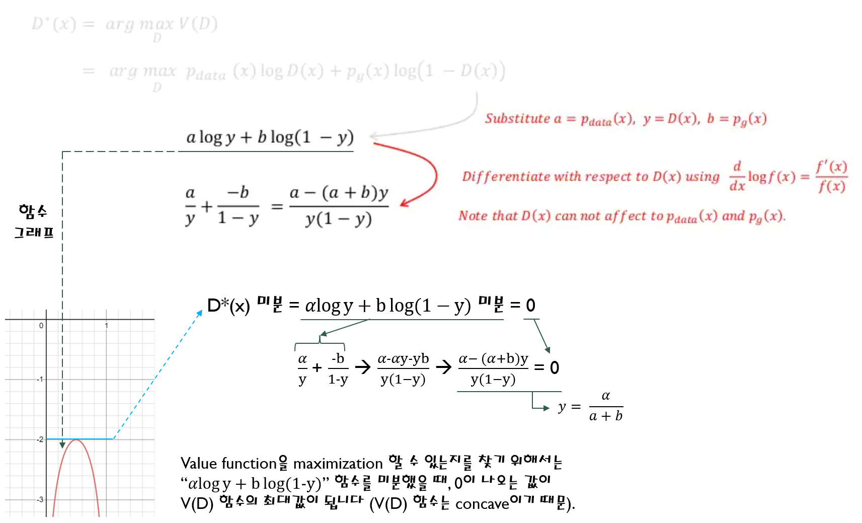 "그럼, 이제부터 어떻게 optimal discriminator 수식이 V(D,G) 수식에서 \(D^{*}(x)=\frac{P_{data}(x)}{P_{data}(x)+P_{g}(x)}\) 수식으로 유도되는지 수학적으로 살펴볼까요?"