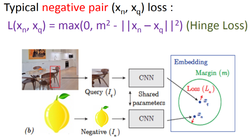 또한, negative pair 끼리는 Euclidan distance 값이 커지도록 설정해줄 수 있습니다. 아래 수식을 보면, margin (m) 이라는 개념이 도입되는데, margin은 negative pair간의 최소한의 거리를 의미합니다. 예를 들어, 우리는 loss 값이 최소가 되기를 바라는데, negative pair (xn, xq) 의 거리가 m 보다 작다면 계속해서 loss 값을 생성해낼 것 입니다. 그런데, 만약 학습을 통해 negative pair 간의 거리가 m 보다 크게 되면 loss 값을 0으로 수렴시킬 수 있게되죠.