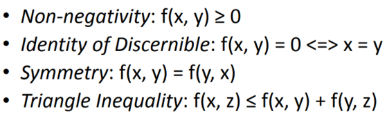 - Triangle Inequality: f(x,z)≤f(x,y)+f(y,z)