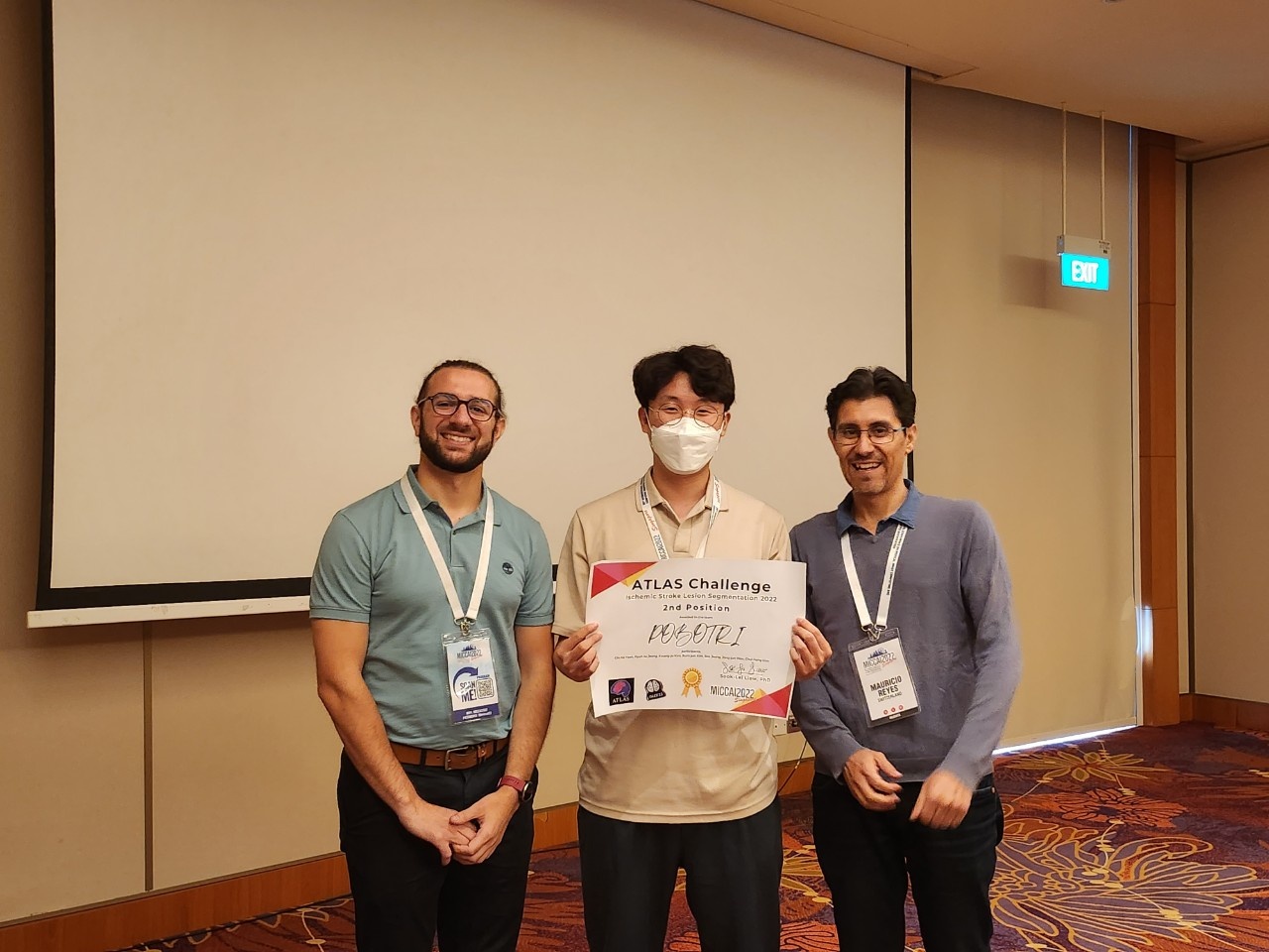 - 팀 단위의 협업 시스템을 통해 짧은 시간안에 다양한 실험을 할 수 있었고, 운 좋게도 MICCAI라는 국제 학회의 ISLES라는 challenge에서 2등을 수상할 수 있었습니다!!