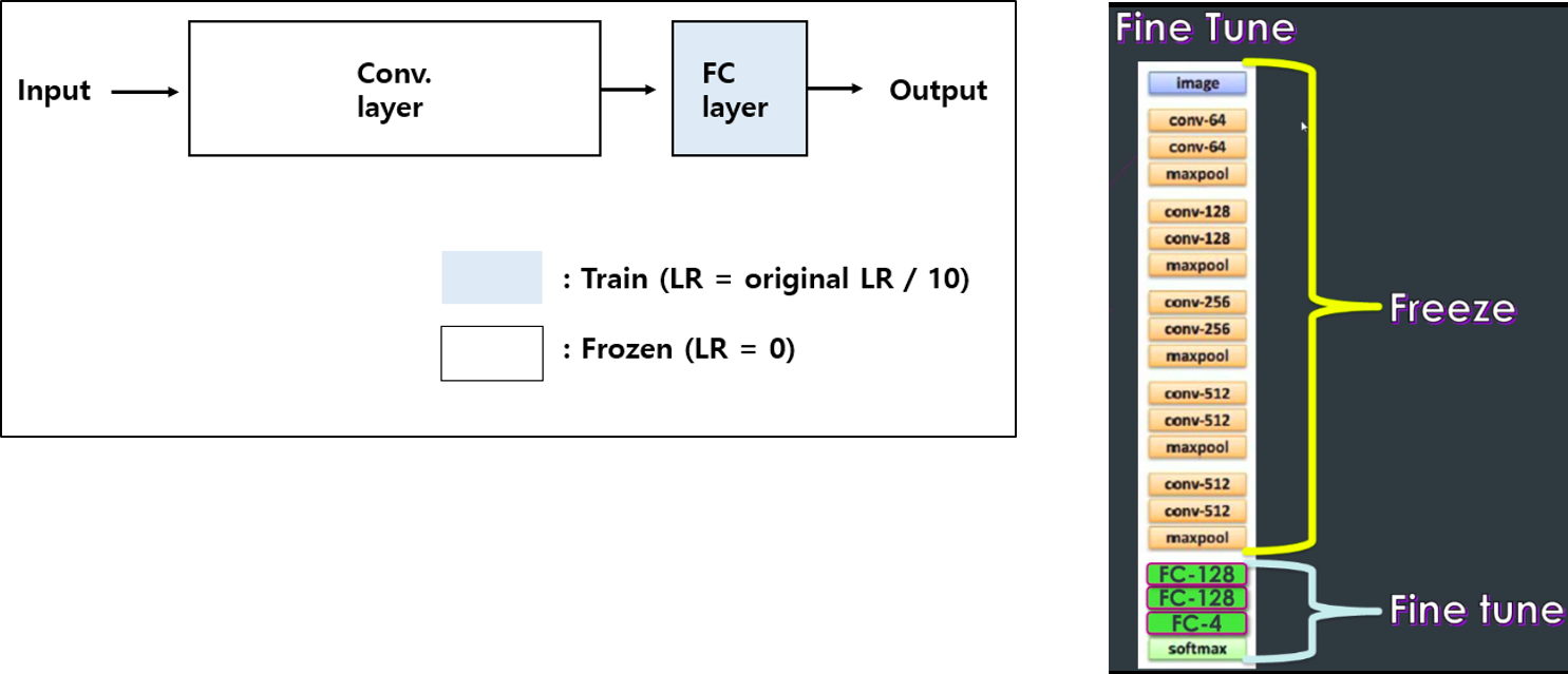 - 위와 같은 문제를 절충하기 위해 아래와 같이 freezing 정도를 설정해주어 fine-tuning을 적용해 줍니다.