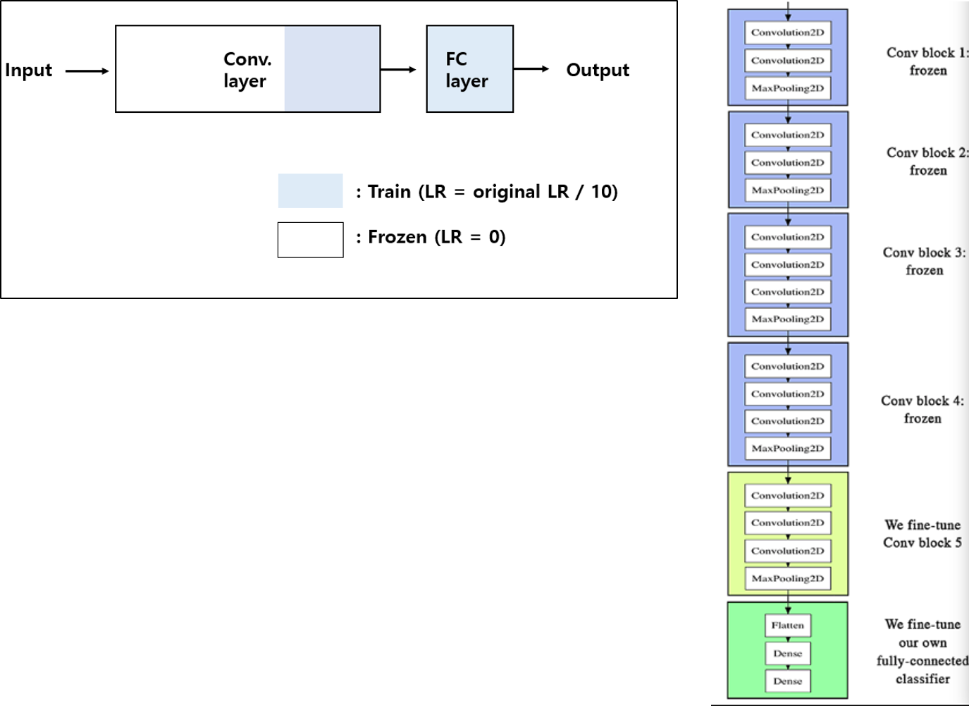 - 데이터가 적기 때문에, 전체 네트워크에 대하여 fine-tuning을 하면, over-fitting 문제가 발생합니다.
