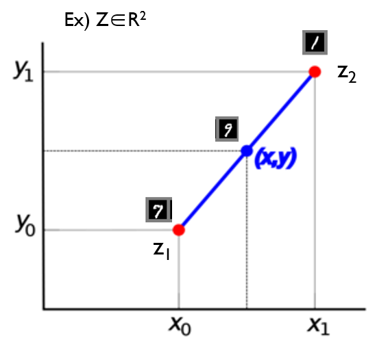 이렇게 찾은 z값들 간에 vector linear interpolation을 하게 되면, 7과 1사이의 z 중간 값이 9가 나오는걸 확인할 수 있습니다.