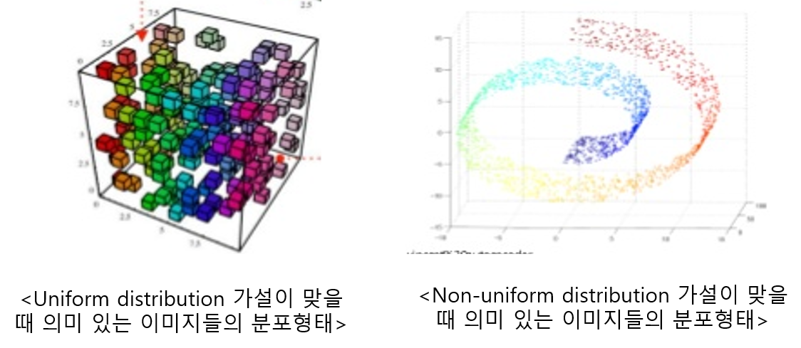가운데 실선에 해당하는 데이터 셋이 제일 많다고 하면, VAE는 제일 데이터 셋이 많은 그룹에 맞게 distribution을 형성하면서 동시에 normal distribution을 이용해 주변 이미지 그룹들도 다 포괄할 수 있도록 학습을 하기 때문에 모든 데이터 그룹을 포괄하려는 것을 볼 수 있습니다.